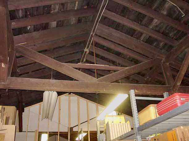 The building is very long (87 feet) and it was impossible to get a good before photograph of its entire length with my SLR film camera. If it werent for a friend and his digital camera, Im afraid that I may not have had any photographs to share! Starting with what is on the other side of the door in this picture, I will walk you through the building from end to end to help you understand the construction. That door takes you to the little semicircular copper-roofed room which is visible on the original exterior photograph. I currently refer to it the extension gallery, which in actuality is the main entrance to the building. Since we will not be working on this room for quite a while, I have not included any photos of its interior. As the renovation progresses into that room, new pictures will appear along with some rather fascinating text. Below we are standing in my painting studio, and you are looking at one of the three natural stone walls that will remain exposed. All walls are 18 inches thick and every stone was gathered from local farm fields and brought to the Ringling worksite by horse or oxen cart. There are three small windows in this wall, but because of the pallet racks filled with supplies only one is visible. The sun tracks across this side of the building throughout the year, which in turn distributes good light and creates a nice warm interior glow. ![]() As we turn around and back up a bit, you can see the wall that is being erected to close off my painting area. If you look very carefully through the studs, you can see all the way to the other end of the building. In the peaked area and on the other side of the recently installed drywall, is one of the original trusses. ![]() Standing in the same place, but looking up, you can see another truss and the high rustic ceiling. Insulating from the roof up will prevent heat loss and allow for the natural old wood beams to remain exposed. Ceiling fans will eventually be installed to force warm air down for additional comfort below. ![]() We have now moved into the next section or gallery area and are looking back toward my painting studio. It is difficult to describe, but doors leading into this center section will not be visible. There are actually two walls here that you are seeing. One wall reaches the ceiling, which has been partially installed and visible behind the truss, and the other has been designed as a short 86 floating partition. This was done to maximize wall space and to eliminate visual interruptions within the gallery. Back when this building was built, symmetry was often a design characteristic, so I have chosen to reflect this motif in my design of the gallery. In other words, the same configuration of walls that is happening on this side repeats itself in a mirror image on the opposite side. ![]() If we move a little closer to the floating wall studs and turn slightly to our left, which faces the rear of the building, you can see the height of the floating partition. It now abuts another wall. This jut out is actually a little room that I created to house one of the new furnaces, which already sits inside. This furnace room is not square, but has an angled wall that faces toward the center of the gallery. This design will allow artwork on this wall, along with all other artwork to be seen in one easy glance. The stone wall along the back will remain exposed. ![]() Remaining in the gallery area, but now turned to your right, you face the front (street) side of the building and the great arch. To gain a sense for size, a compact car can be driven through the doorway within the arch! The stone and arch of this impressive wall will not be covered and will remain as you see it. The lighting we have planned will make it even more dramatic! My husband would love to replace the entire arch with plate glass! But being situated so close to the road and at the rate that we have seen the snow plows go by, all it would take would be one stone and wed have crackled glass instead! I can't imagine the cost for such an idea, however it is an interesting one! A very dear and long