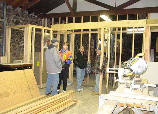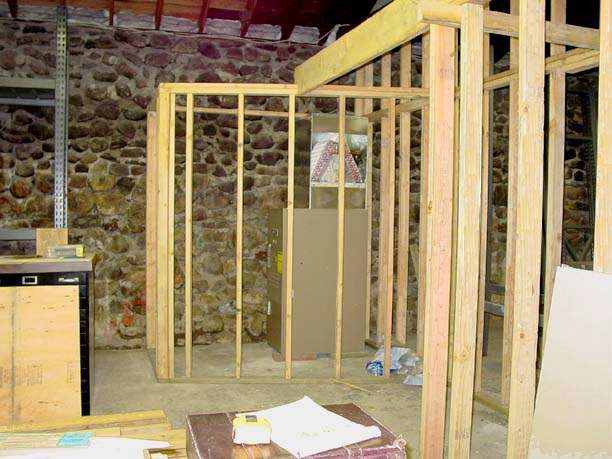 was a chimney that served no purpose and had to come down. Next we had to pour a new floor for the bathroom because the concrete was not level in that area. In order for cement to adhere properly it should be poured on a clean surface so that it can bond to the existing concrete. Creating that bond was impossible -- the floor had been painted! Arno tried everything to get the paint off, but it wouldn't lift no matter what! The only solution was for the two of us to sit on the floor with a hammer and chisel and chip away the paint inch by inch! The framework for the bathroom floor -- ready for cement. Bathroom floor poured, tiles laid, grout in and wall studs up! You'll notice that there appears to be a space behind the bath. That area will be for an all purpose sink in the L shaped kitchenette. Here you are standing in the main framing room looking down the hall and facing the end wall with an emergency exit. The handicapped accessible bathroom, kitchenette and framing room 2 are on your right. Furnace 2 and tool room are on your left. To see the most recent renovation photos, close this page and click on Interior Renovation - January 2007. |
