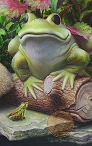 Green Frog Traditional Miniature Acrylic Image: 4 x 2 1/2" Frame: 7 1/2 x 6" Triple Hand Wrapped Fabric Mats The penny appearing on the artwork is only for scale. Decoys & Wildlife Gallery Frenchtown, NJ 888-996-6501 or visit www.decoyswildlife.com/gallery/linda.rossin