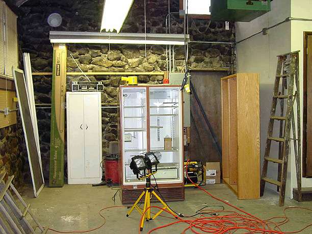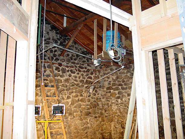 The building is very long (87 feet) and it was impossible to get a good before photograph of its entire length with my SLR film camera. If it werent for a friend and his digital camera, Im afraid that I may not have had any photographs to share! Starting with what is on the other side of the door in this picture, I will walk you through the building from end to end to help you understand the construction. That door takes you to the little semicircular copper-roofed room which is visible on the original exterior photograph. I currently refer to it the extension gallery, which in actuality is the main entrance to the building. Since we will not be working on this room for quite a while, I have not included any photos of its interior. As the renovation progresses into that room, new pictures will appear along with some rather fascinating text. Below we are standing in my painting studio, and you are looking at one of the three natural stone walls that will remain exposed. All walls are 18 inches thick and every stone was gathered from local farm fields and brought to the Ringling worksite by horse or oxen cart. There are three small windows in this wall, but because of the pallet racks filled with supplies only one is visible. The sun tracks across this side of the building throughout the year, which in turn distributes good light and creates a nice warm interior glow. ![]() As we turn around and back up a bit, you can see the wall that is being erected to close off my painting area. If you look very carefully through the studs, you can see all the way to the other end of the building. In the peaked area and on the other side of the recently installed drywall, is one of the original trusses. ![]() Standing in the same place, but looking up, you can see another truss and the high rustic ceiling. Insulating from the roof up will prevent heat loss and allow for the natural old wood beams to remain exposed. Ceiling fans will eventually be installed to force warm air down for additional comfort below. ![]() We have now moved into the next section or gallery area and are looking back toward my painting studio. It is difficult to describe, but doors leading into this center section will not be visible. There are actually two walls here that you are seeing. One wall reaches the ceiling, which has been partially installed and visible behind the truss, and the other has been designed as a short 86 floating partition. This was done to maximize wall space and to eliminate visual interruptions within the gallery. Back when this building was built, symmetry was often a design characteristic, so I have chosen to reflect this motif in my design of the gallery. In other words, the same configuration of walls that is happening on this side repeats itself in a mirror image on the opposite side. ![]() If we move a little closer to the floating wall studs and turn slightly to our left, which faces the rear of the building, you can see the height of the floating partition. It now abuts another wall. This jut out is actually a little room that I created to house one of the new furnaces, which already sits inside. This furnace room is not square, but has an angled wall that faces toward the center of the gallery. This design will allow artwork on this wall, along with all other artwork to be seen in one easy glance. The stone wall along the back will remain exposed. ![]() Remaining in the gallery area, but now turned to your right, you face the front (street) side of the building and the great arch. To gain a sense for size, a compact car can be driven through the doorway within the arch! The stone and arch of this impressive wall will not be covered and will remain as you see it. The lighting we have planned will make it even more dramatic! My husband would love to replace the entire arch with plate glass! But being situated so close to the road and at the rate that we have seen the snow plows go by, all it would take would be one stone and wed have crackled glass instead! I can't imagine the cost for such an idea, however it is an interesting one! A very dear and long
