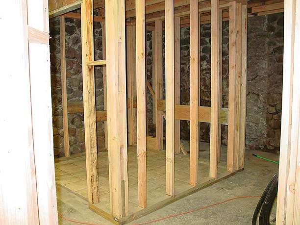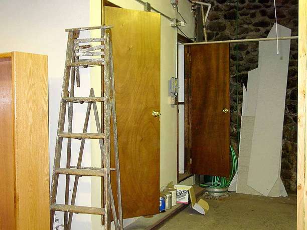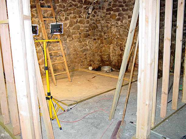 was a chimney that served no purpose and had to come down. Next we had to pour a new floor for the bathroom because the concrete was not level in that area. In order for cement to adhere properly it should be poured on a clean surface so that it can bond to the existing concrete. Creating that bond was impossible -- the floor had been painted! Arno tried everything to get the paint off, but it wouldn't lift no matter what! The only solution was for the two of us to sit on the floor with a hammer and chisel and chip away the paint inch by inch! The framework for the bathroom floor -- ready for cement. Bathroom floor poured, tiles laid, grout in and wall studs up! You'll notice that there appears to be a space behind the bath. That area will be for an all purpose sink in the L shaped kitchenette. Here you are standing in the main framing room looking down the hall and facing the end wall with an emergency exit. The handicapped accessible bathroom, kitchenette and framing room 2 are on your right. Furnace 2 and tool room are on your left. To see the most recent renovation photos, close this page and click on Interior Renovation - January 2007. |