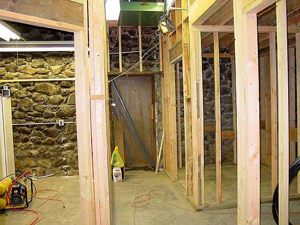was a chimney that served no purpose and had to come down. Next we had to pour a new floor for the bathroom because the concrete was not level in that area. In order for cement to adhere properly it should be poured on a clean surface so that it can bond to the existing concrete. Creating that bond was impossible -- the floor had been painted! Arno tried everything to get the paint off, but it wouldn't lift no matter what! The only solution was for the two of us to sit on the floor with a hammer and chisel and chip away the paint inch by inch! The framework for the bathroom floor -- ready for cement. Bathroom floor poured, tiles laid, grout in and wall studs up! You'll notice that there appears to be a space behind the bath. That area will be for an all purpose sink in the L shaped kitchenette. Here you are standing in the main framing room looking down the hall and facing the end wall with an emergency exit. The handicapped accessible bathroom, kitchenette and framing room 2 are on your right. Furnace 2 and tool room are on your left. To see the most recent renovation photos, close this page and click on Interior Renovation - January 2007. |