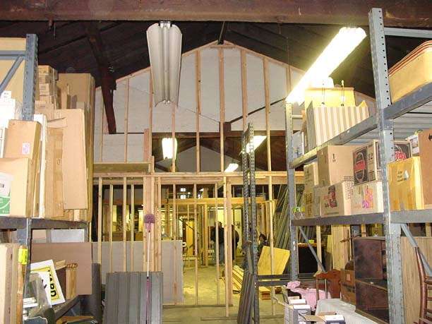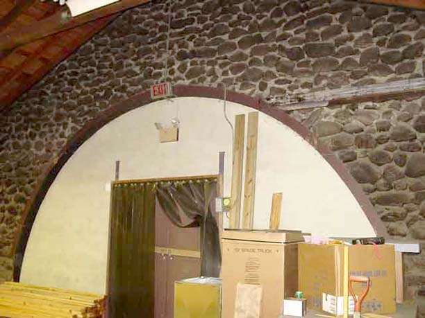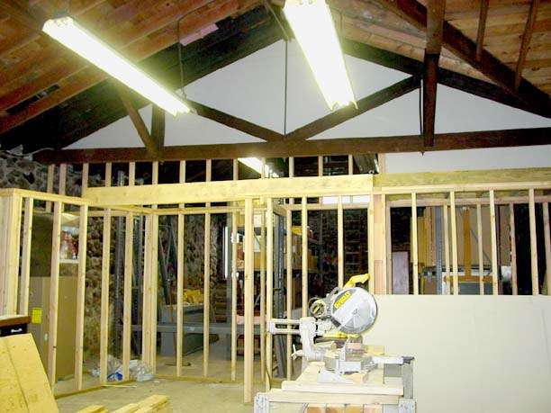 The building is very long (87 feet) and it was impossible to get a good before photograph of its entire length with my SLR film camera. If it werent for a friend and his digital camera, Im afraid that I may not have had any photographs to share! Starting with what is on the other side of the door in this picture, I will walk you through the building from end to end to help you understand the construction. That door takes you to the little semicircular copper-roofed room which is visible on the original exterior photograph. I currently refer to it the extension gallery, which in actuality is the main entrance to the building. Since we will not be working on this room for quite a while, I have not included any photos of its interior. As the renovation progresses into that room, new pictures will appear along with some rather fascinating text. Below we are standing in my painting studio, and you are looking at one of the three natural stone walls that will remain exposed. All walls are 18 inches thick and every stone was gathered from local farm fields and brought to the Ringling worksite by horse or oxen cart. There are three small windows in this wall, but because of the pallet racks filled with supplies only one is visible. The sun tracks across this side of the building throughout the year, which in turn distributes good light and creates a nice warm interior glow. ![]() As we turn around and back up a bit, you can see the wall that is being erected to close off my painting area. If you look very carefully through the studs, you can see all the way to the other end of the building. In the peaked area and on the other side of the recently installed drywall, is one of the original trusses. ![]() Standing in the same place, but looking up, you can see another truss and the high rustic ceiling. Insulating from the roof up will prevent heat loss and allow for the natural old wood beams to remain exposed. Ceiling fans will eventually be installed to force warm air down for additional comfort below. ![]() We have now moved into the next section or gallery area and are looking back toward my painting studio. It is difficult to describe, but doors leading into this center section will not be visible. There are actually two walls here that you are seeing. One wall reaches the ceiling, which has been partially installed and visible behind the truss, and the other has been designed as a short 86 floating partition. This was done to maximize wall space and to eliminate visual interruptions within the gallery. Back when this building was built, symmetry was often a design characteristic, so I have chosen to reflect this motif in my design of the gallery. In other words, the same configuration of walls that is happening on this side repeats itself in a mirror image on the opposite side. ![]() If we move a little closer to the floating wall studs and turn slightly to our left, which faces the rear of the building, you can see the height of the floating partition. It now abuts another wall. This jut out is actually a little room that I created to house one of the new furnaces, which already sits inside. This furnace room is not square, but has an angled wall that faces toward the center of the gallery. This design will allow artwork on this wall, along with all other artwork to be seen in one easy glance. The stone wall along the back will remain exposed. ![]() Remaining in the gallery area, but now turned to your right, you face the front (street) side of the building and the great arch. To gain a sense for size, a compact car can be driven through the doorway within the arch! The stone and arch of this impressive wall will not be covered and will remain as you see it. The lighting we have planned will make it even more dramatic! My husband would love to replace the entire arch with plate glass! But being situated so close to the road and at the rate that we have seen the snow plows go by, all it would take would be one stone and wed have crackled glass instead! I can't imagine the cost for such an idea, however it is an interesting one! A very dear and long
